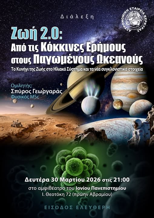 Αστρονομική Εταιρεία: Διάλεξη με θέμα «Ζωή 2.0: Από τις Κόκκινες Ερήμους στους Παγωμένους Ωκεανούς.»