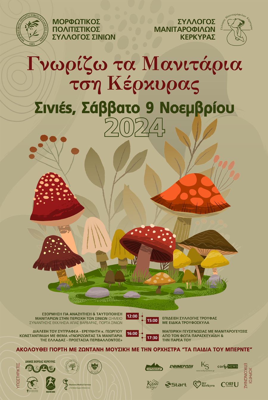 Οι εκδηλώσεις έχουν την υποστήριξη του Δήμου Βόρειας Κέρκυρας ,του Τοπικού Συμβουλίου Σινιών , της ΚΟΙΝΣΕΠ Σινιών ,του Συλλόγου Μανιταρόφιλων Ελλάδος , του Συλλόγου Κάσσιου Δία και ιδιοκτητών καταλυμάτων της περιοχής όπου θα φιλοξενήσουν τις αποστολές των Μανιταρόφιλων από το εξωτερικό και την υπόλοιπη Ελλάδα.
