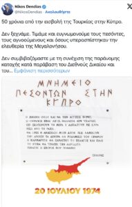 Ο υπουργός Εθνικής ‘Αμυνας Νίκος Δένδιας, στην ανάρτησή του στον προσωπικό λογαριασμό του στο ” Χ “, με αφορμή τη συμπλήρωση 50 χρόνων από την τουρκική εισβολή στην Κύπρο επισήμανε: