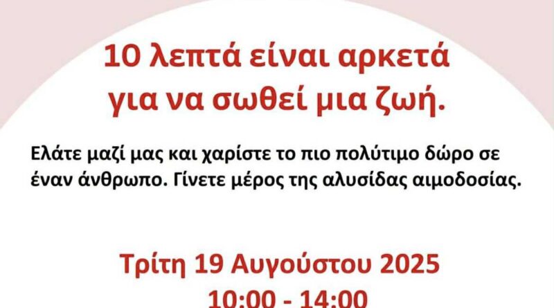 Στις 19 Αυγούστου δίνουμε αίμα, δίνουμε ζωή