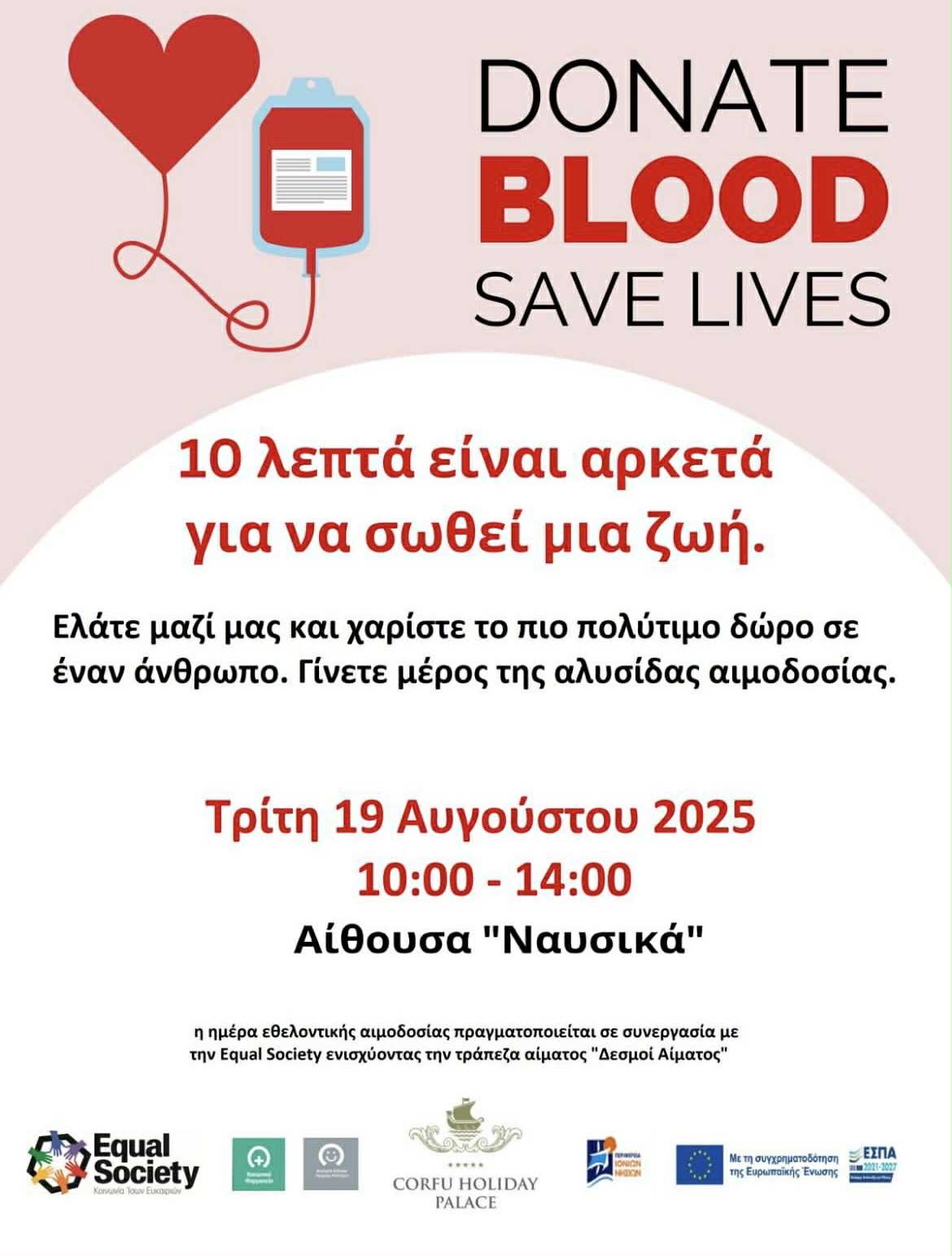 Το Corfu Holiday Palace σε συνεργασία με την Equal Society, με αφορμή την αυξημένη καθημερινή ανάγκη για αίμα, διοργανώνει δράση εθελοντικής αιμοδοσίας την Τρίτη 19 Αυγούστου με στόχο την ενίσχυση της τράπεζας αίματος «Δεσμοί Αίματος» του Οργανισμού.