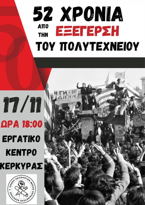 ΕΛΜΕ: 52 χρόνια από τον ξεσηκωμό του Πολυτεχνείου το 1973: εκπαιδευτικοί, μαθητές, εργαζόμενοι ανταμώνουμε ξανά στους δρόμους του αγώνα! – Αντιιμπεριαλιστική συγκέντρωση Δευτέρα 17 Νοέμβρη στις 18.00 στο Εργατικό Κέντρο