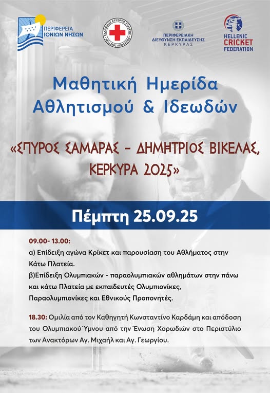 Η Ελληνική Ομοσπονδία Κρίκετ, σε συνδιοργάνωση με την Περιφέρεια Ιονίων Νήσων και με την υποστήριξη του Υπουργείου Παιδείας, Θρησκευμάτων και Αθλητισμού και της Περιφερειακής Διεύθυνσης Α΄βάθμιας & Β/βάθμιας Εκπαίδευσης Ιονίων Νήσων, διοργανώνει την Μαθητική Ημερίδα Αθλητισμού & Ιδεωδών «Σπύρος Σαμάρας – Δημήτριος Βικέλας», η οποία θα πραγματοποιηθεί την Πέμπτη 25 Σεπτεμβρίου 2025 στην Κέρκυρα.