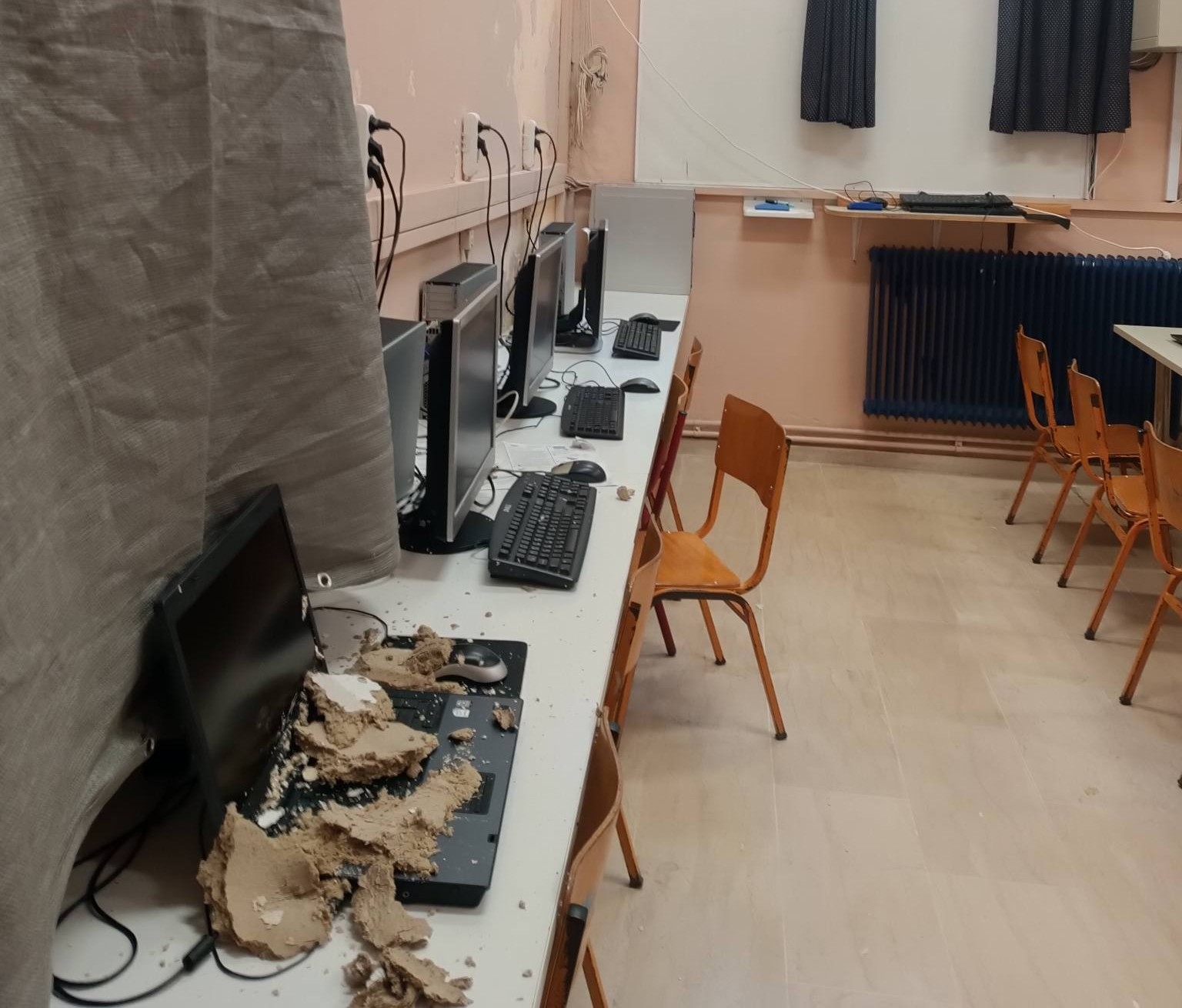 Συγκεκριμένα: Πλημμύρισε το υπόγειο του 6ου δημοτικού με 25 πόντους νερό. Η πυροσβεστική αν δεν είναι 30 πόντους και πάνω δεν το αντλεί. Από την στέγη έπεσαν σοβάδες στην αίθουσα πληροφορικής.