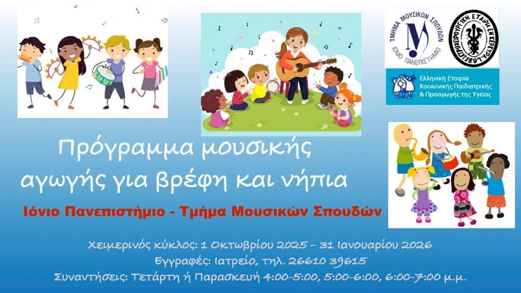 Πρόγραμμα μουσικής αγωγής για βρέφη και νήπια 1 Οκτωβρίου 2025 – 31 Ιανουαρίου 2026. Τμήμα Μουσικών Σπουδών του Ιονίου Πανεπιστημίου