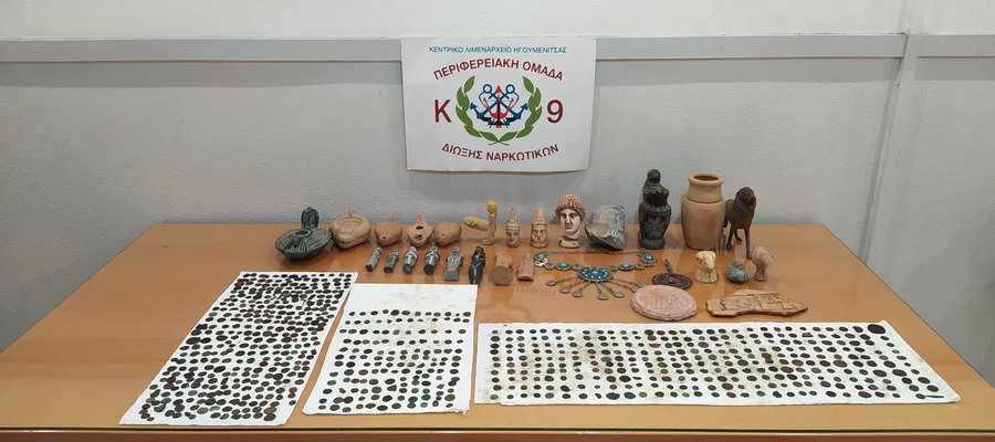 Συγκεκριμένα, σε έλεγχο που διενεργήθηκε από τα εν λόγω στελέχη στην πύλη εισόδου του λιμένα εξωτερικού Ηγουμενίτσας σε Ι.Χ.Ε. όχημα, με οδηγό τον 52χρονο και συνοδηγό τον 49χρονο, εντοπίστηκαν, επιμελώς κρυμμένα, εντός του χώρου αποσκευών του ως άνω οχήματος, είκοσι οκτώ (28) αντικείμενα (αγαλματίδια, κολιέ, μενταγιόν, λυχνάρια, βάζο κ.τ.λ.) πιθανόν αρχαία καθώς και επτακόσια εβδομήντα εννέα (779) αρχαία νομίσματα, με σκοπό οι ανωτέρω να τα μεταφέρουν από κοινού παράνομα στο εξωτερικό.