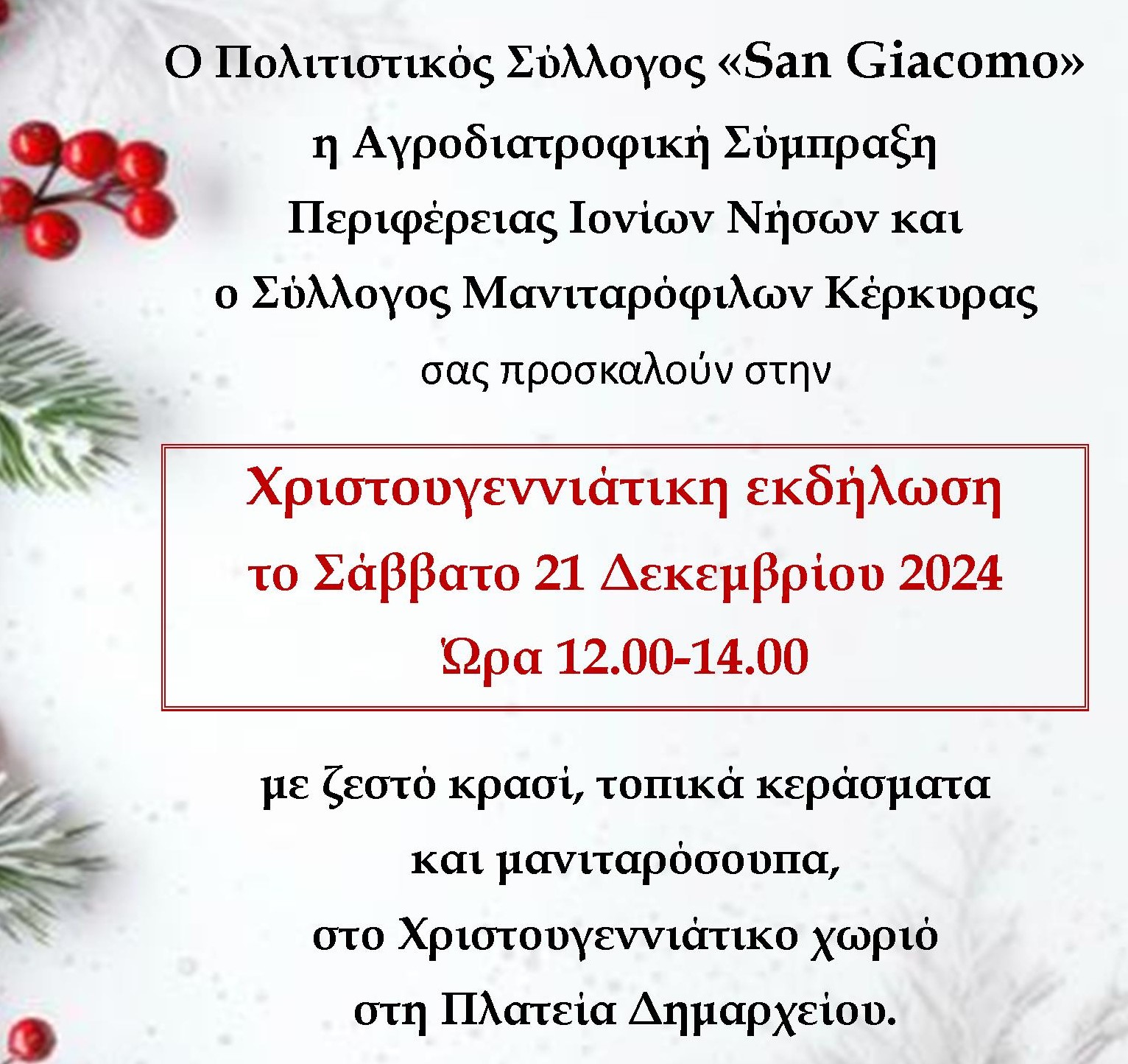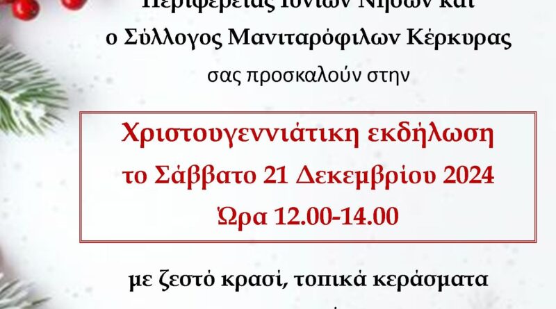 Χριστουγεννιάτικη Εκδήλωση της Αγροδιατροφικής, του συλλόγου Μανιταρόφιλων Κέρκυρας και του Πολιτιστικού Συλλόγου «San Giacomο»